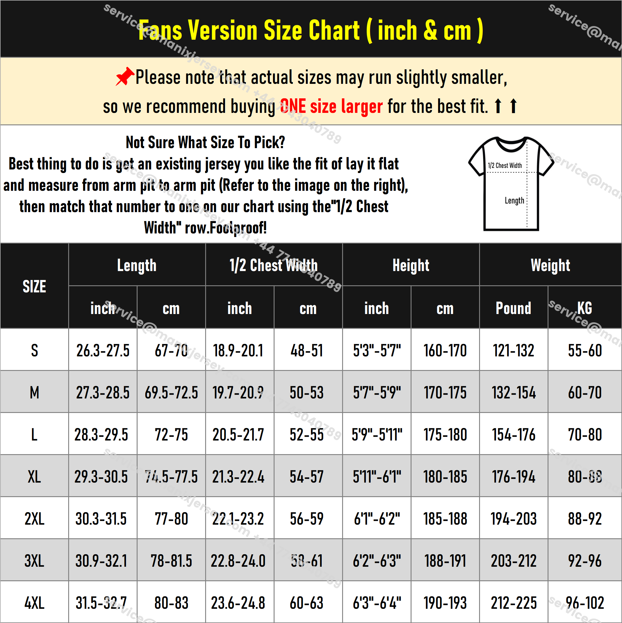 Please note that due to measurement errors, there may be a 1-2 inch discrepancy between the actual jersey size and the size chart, which is considered normal. If your measurements fall between two sizes or if you are overweight or have a muscular build, we highly recommend purchasing a larger size to ensure a more comfortable fit and better wearing experience.